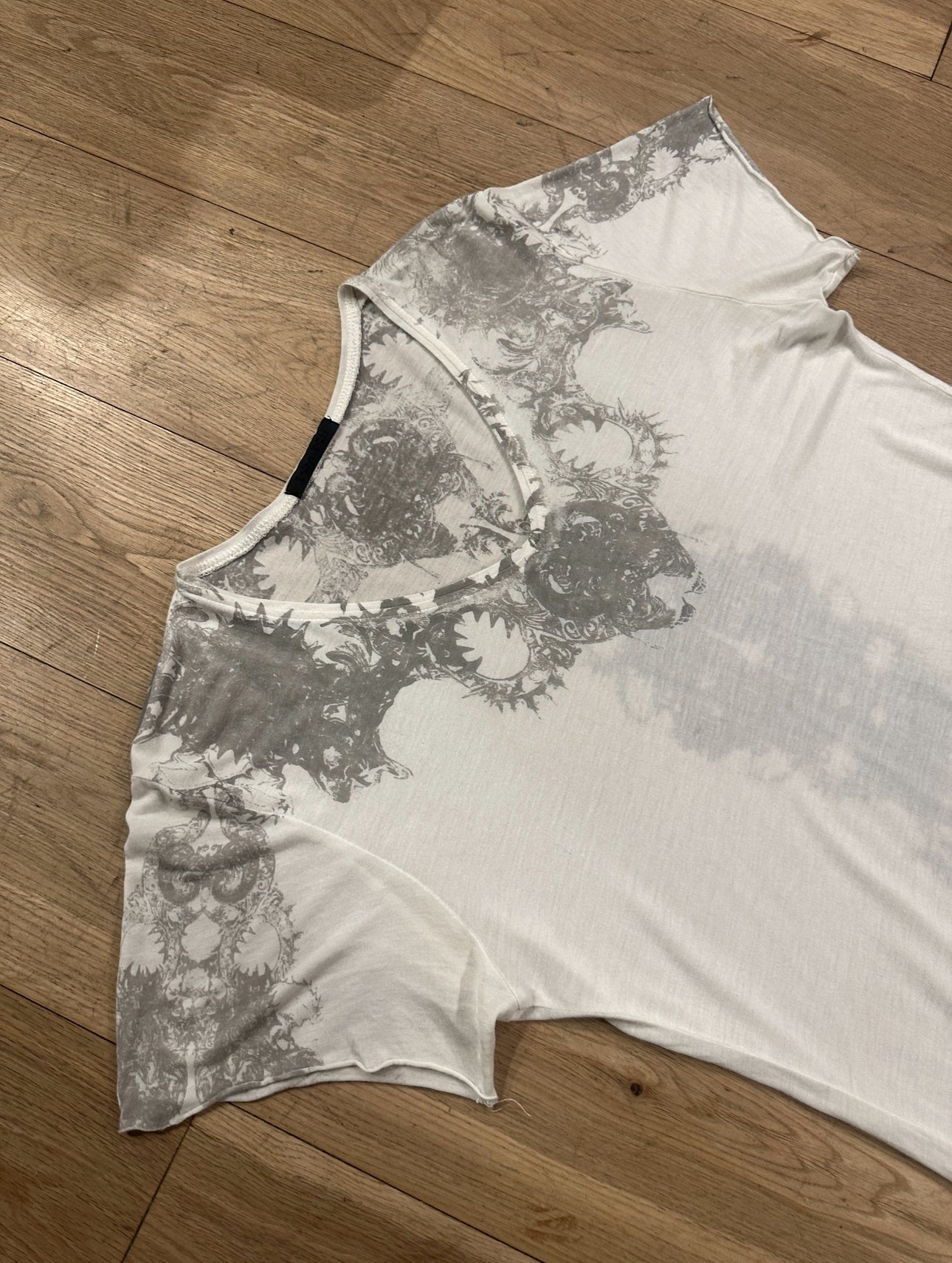 Tagged size 2 (recommended for slim medium, shirt goes slimmer as it goes down from armpit to waist).